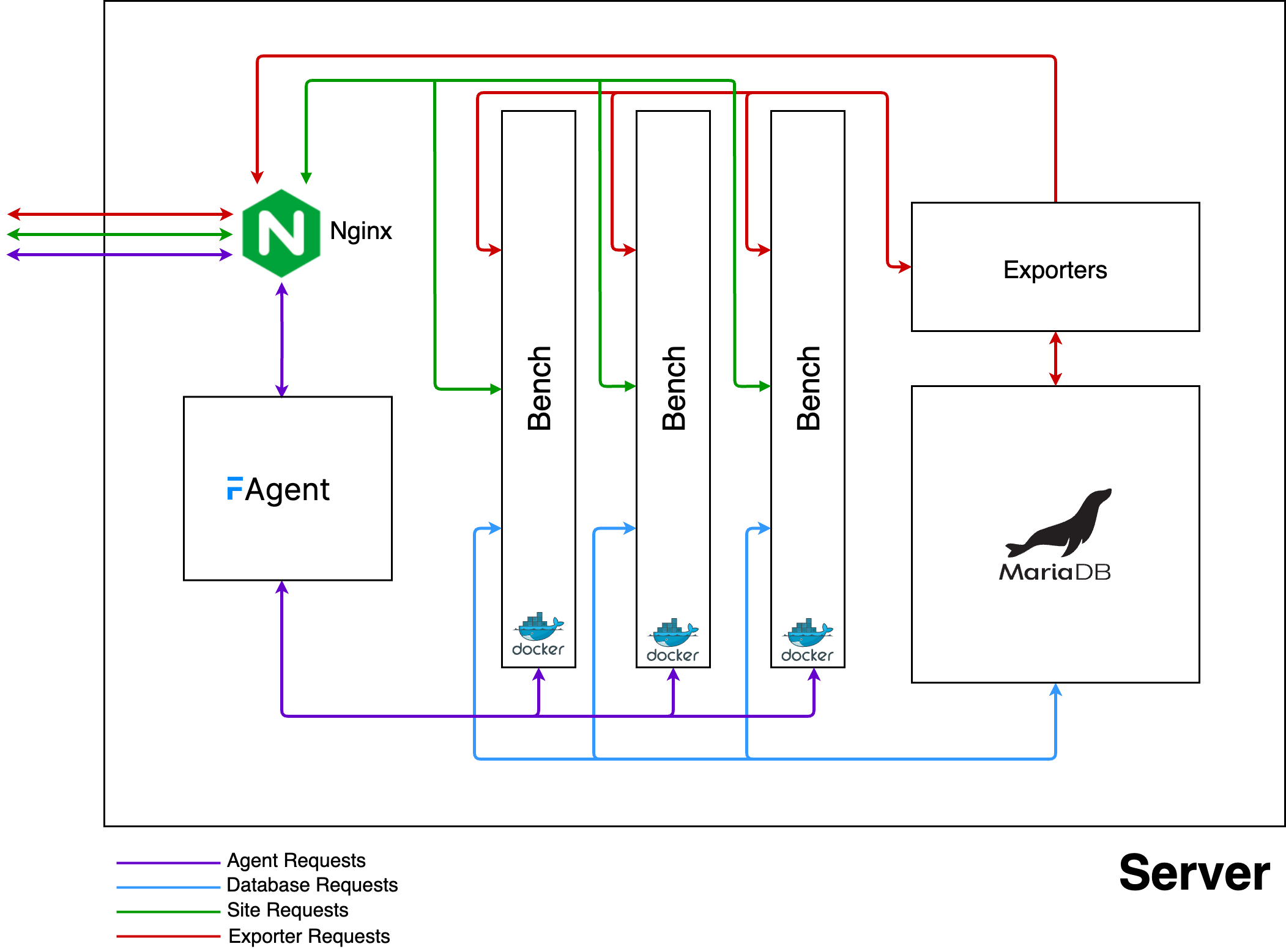 Infrastructure Architecture HLL:An instance of tibERbu runs on an environment called a bench. It exposes all functionalities for use by client requests, application function calls or automated tasks. A bench can sit on a physical server, a virtual machine or an orchestration cluster. Frappe Cloud(FAgent) is an orchestration layer that can accommodate multiple benches and is the basis for setting up the core components of tibERbu EMR(database, redis-cache, and the main engine Frappe Framework). Each bench will have a list of applications ("apps") that run as docker containers inside the bench. An app is usually hosted on GitHub/GitLab and linked to Bench using Frappe Cloud. Frappe Cloud comes with automated CD pipelines that automatically detect updates and provide a user with actions to update and recreate containers, thereby updating the apps. A site is where users interact with the ERP/EMR functionalities through a browser like Google Chrome, Safari, Firefox or any other.